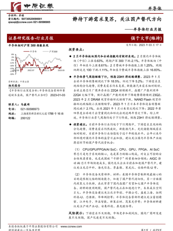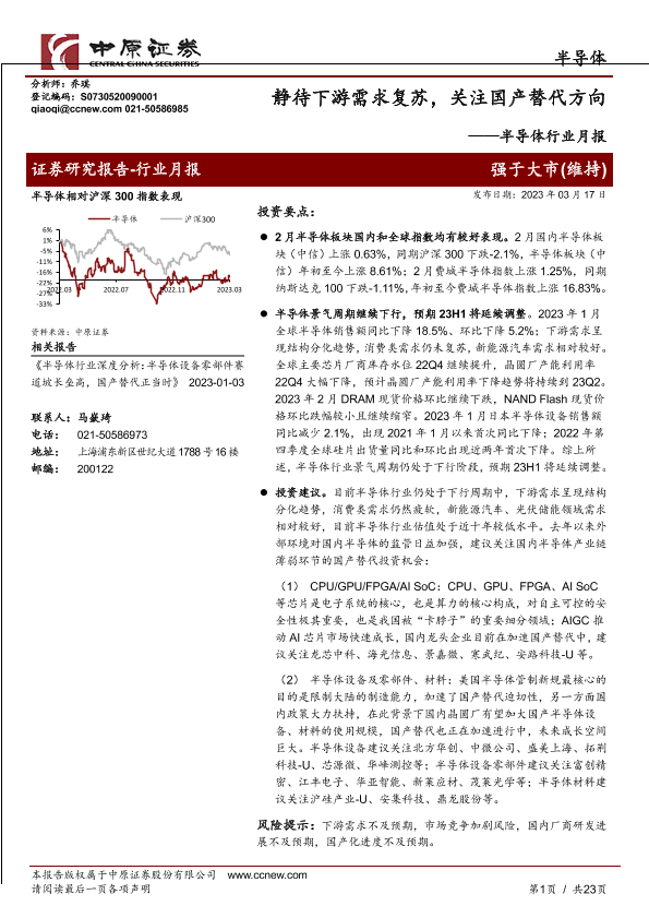 【中原证券】【20230317】半导体行业月报:静待下游需求复苏,关注国产替代方向-23页