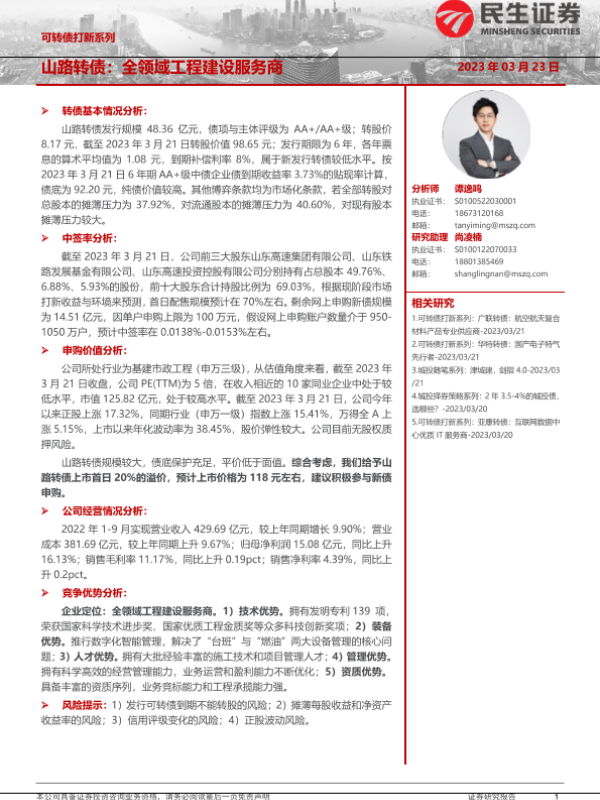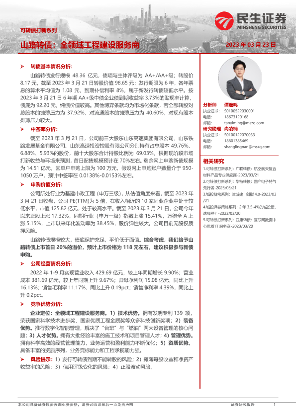 【民生证券】【20230323】可转债打新系列:山路转债,全领域工程建设服务商-15页