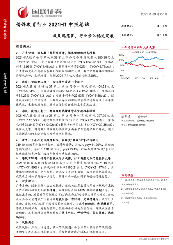 【国联证券】【20210907】传媒教育行业2021H1中报总结:政策规范化,行业步入稳定发展-31页