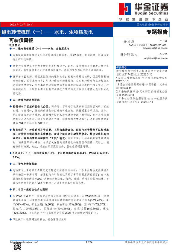 【华金证券】【20230320】可转债周报:绿电转债梳理(一)——水电、生物质发电-24页