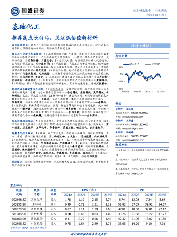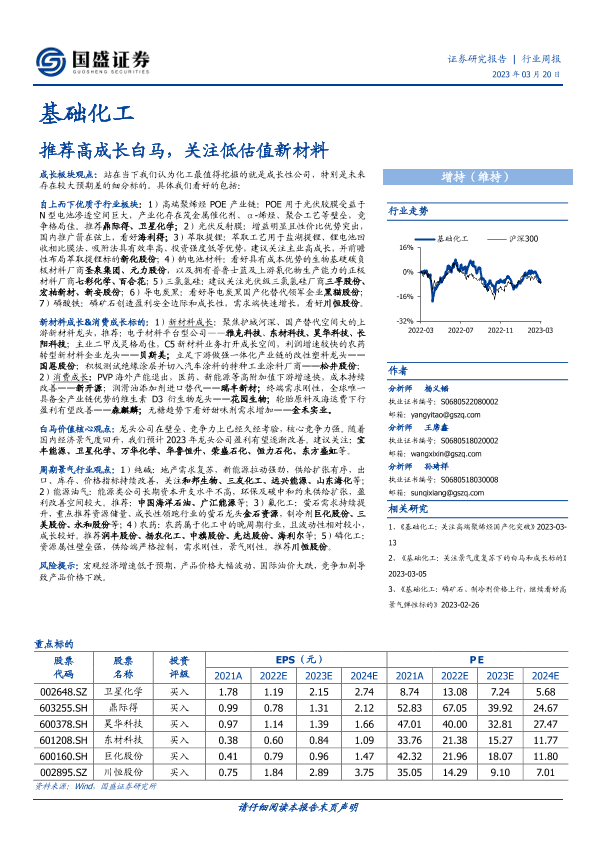 【国盛证券】【20230320】基础化工行业周报:推荐高成长白马,关注低估值新材料-21页
