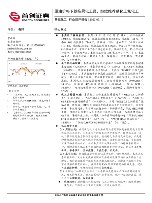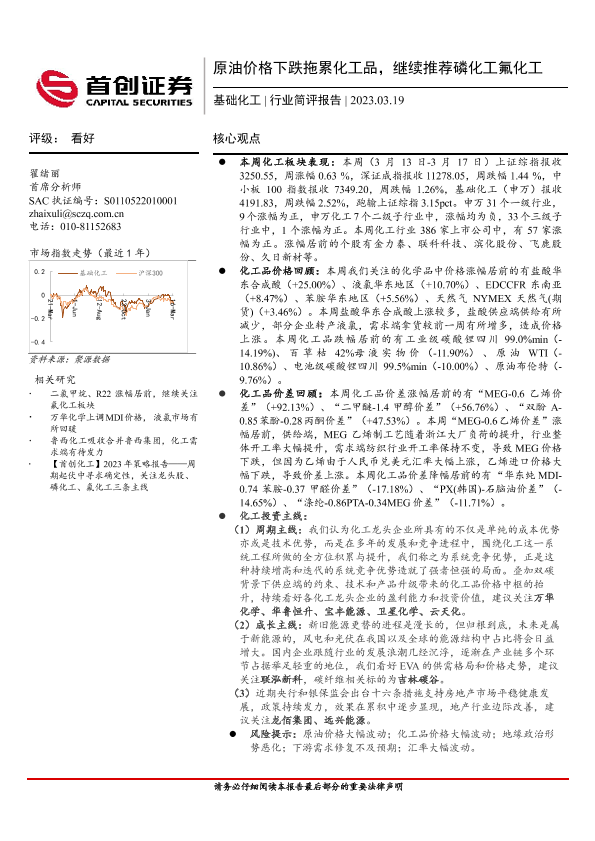 【首创证券】【20230319】基础化工行业简评报告:原油价格下跌拖累化工品,继续推荐磷化工氟化工-17页
