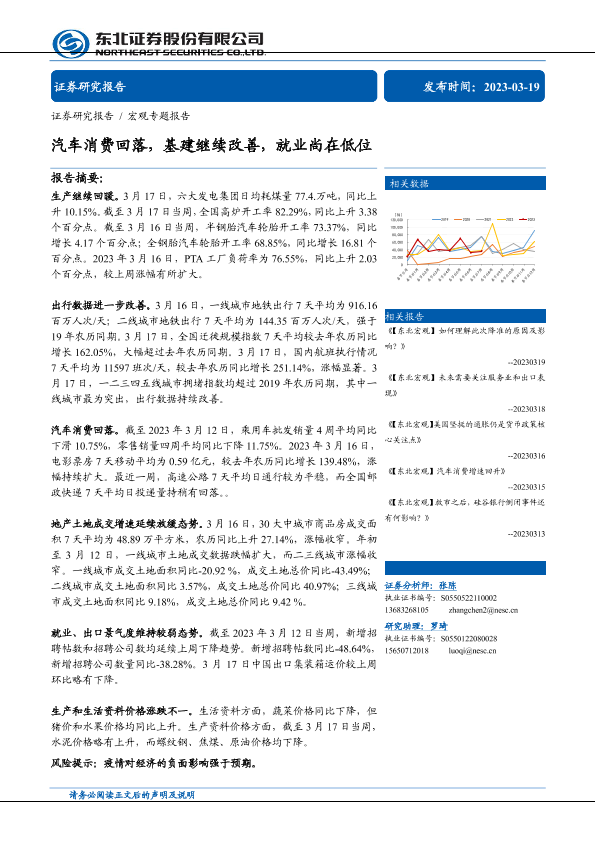 【东北证券】【20230319】宏观专题报告:汽车消费回落,基建继续改善,就业尚在低位-32页