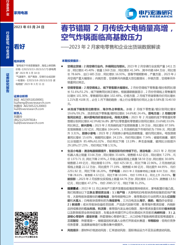 【申万宏源】【20230324】家用电器行业2023年2月家电零售和企业出货端数据解读:春节错期2月传统大电销量高增,空气炸锅面临高基数压力-16页