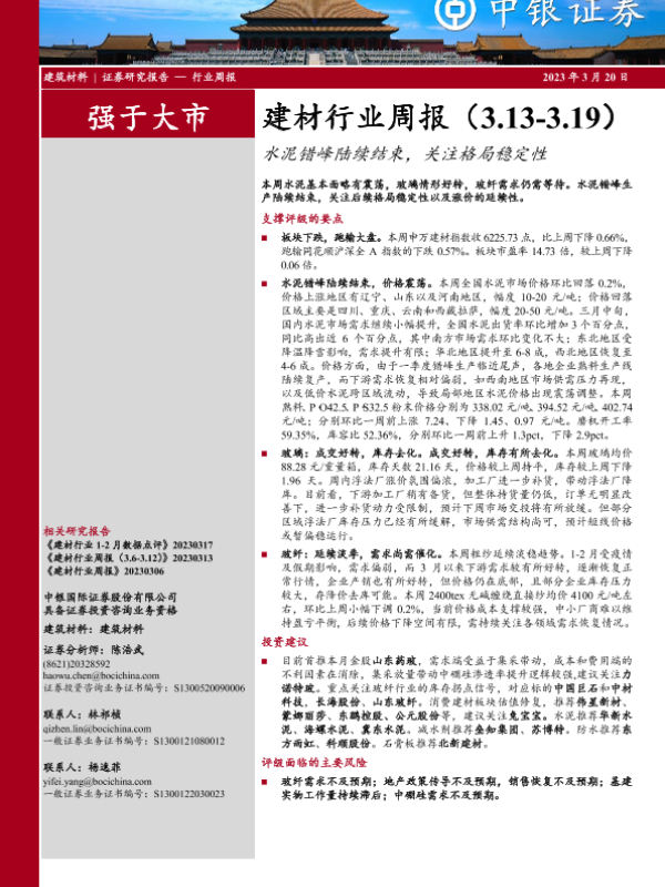 【中银证券】【20230320】建材行业周报:水泥错峰陆续结束,关注格局稳定性-21页