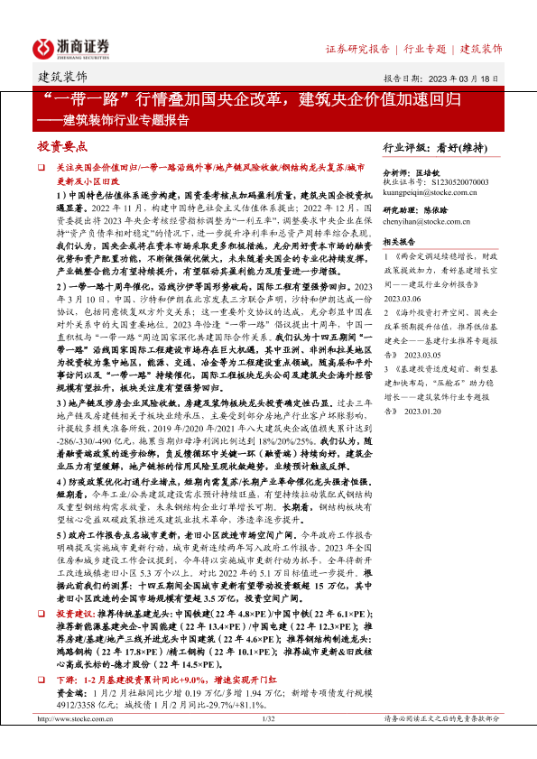 【浙商证券】【20230318】建筑装饰行业专题报告:“一带一路”行情叠加国央企改革,建筑央企价值加速回归-32页