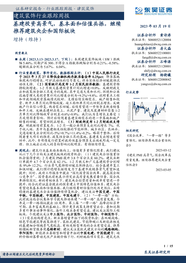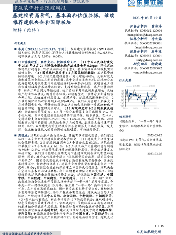【东吴证券】【20230319】建筑装饰行业跟踪周报:基建投资高景气,基本面和估值共振,继续推荐建筑央企和国际板块-15页