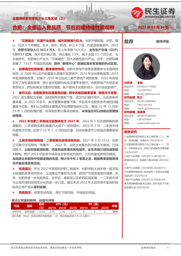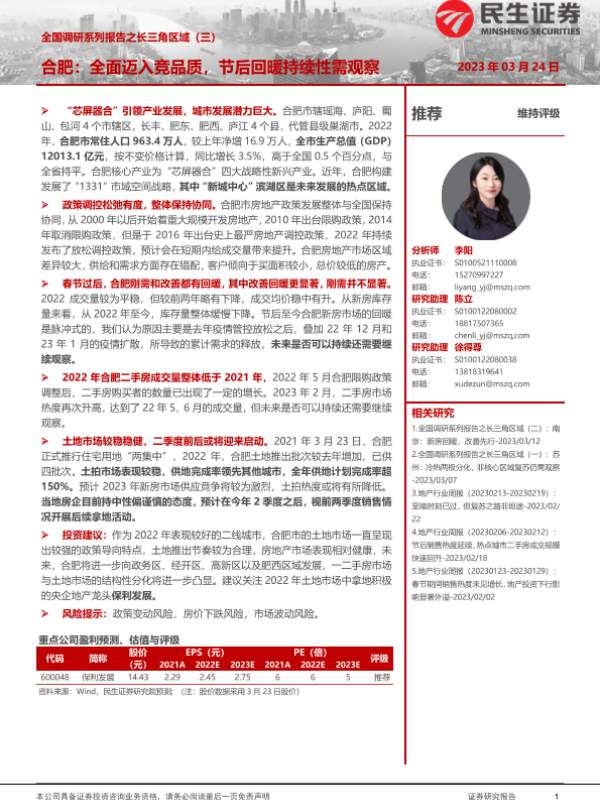 【民生证券】【20230324】房地产行业全国调研系列报告之长三角区域(三):合肥,全面迈入竞品质,节后回暖持续性需观察-18页
