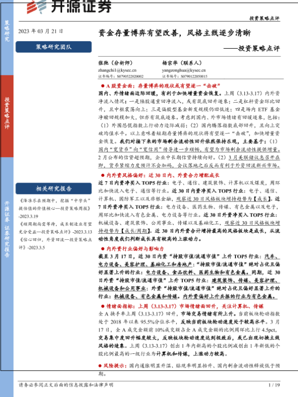 【开源证券】【20230321】资金存量博弈有望改善,风格主线逐步清晰-投资策略点评-19页
