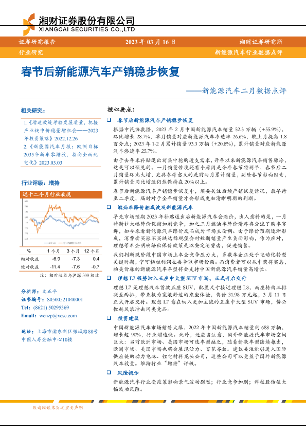 【湘财证券】【20230316】新能源汽车行业二月数据点评:春节后新能源汽车产销稳步恢复-18页