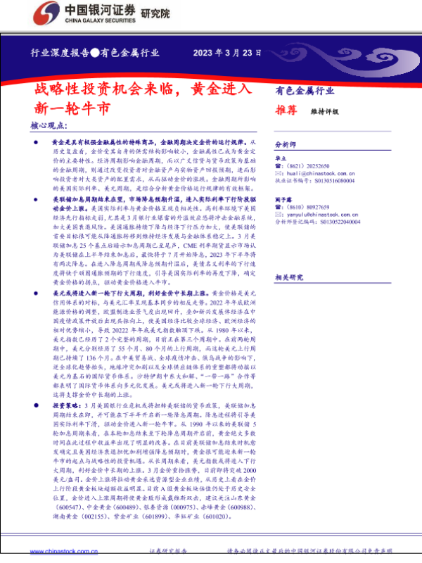 【银河证券】【20230323】有色金属行业深度报告:战略性投资机会来临,黄金进入新一轮牛市-28页
