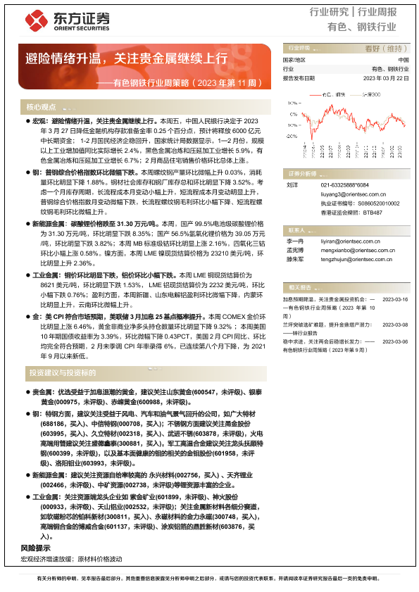 【东方证券】【20230322】有色钢铁行业周策略(2023年第11周):避险情绪升温,关注贵金属继续上行-39页