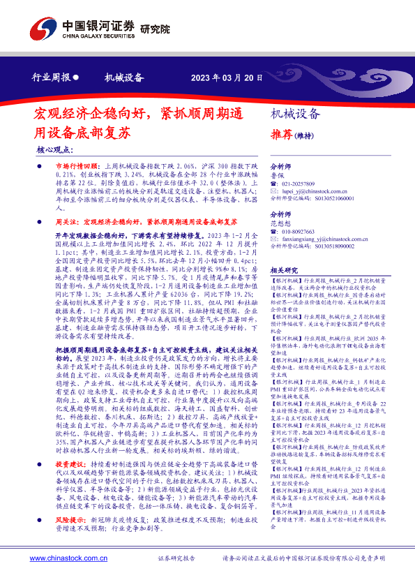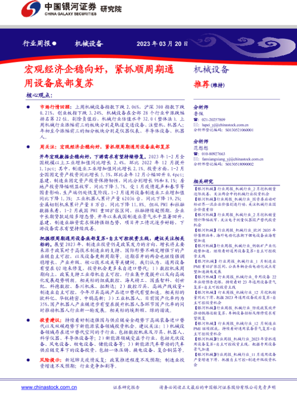 【银河证券】【20230320】机械设备行业周报:宏观经济企稳向好,紧抓顺周期通用设备底部复苏-23页