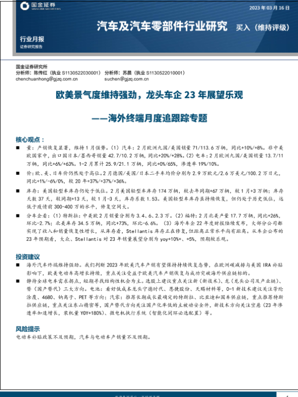 【国金证券】【20230316】汽车及汽车零部件行业月报:海外终端月度追跟踪专题,欧美景气度维持强劲,龙头车企23年展望乐观-15页