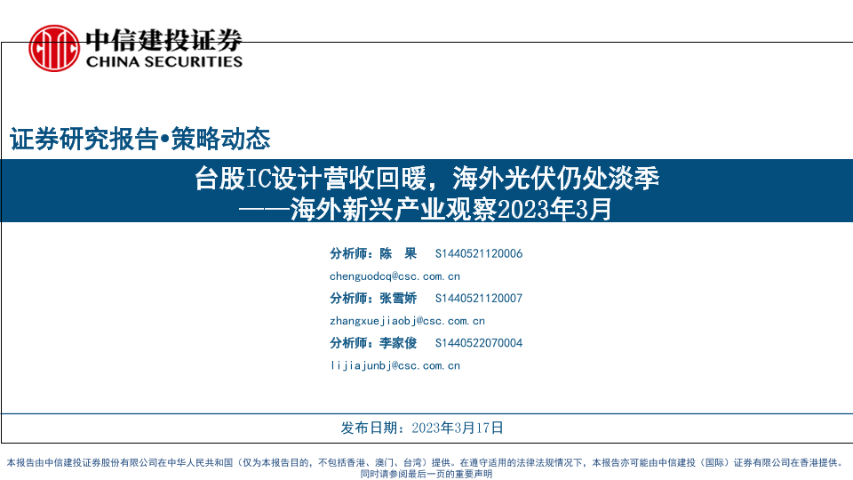 【中信建投证券】【20230317】海外新兴产业观察2023年3月:台股IC设计营收回暖,海外光伏仍处淡季-28页