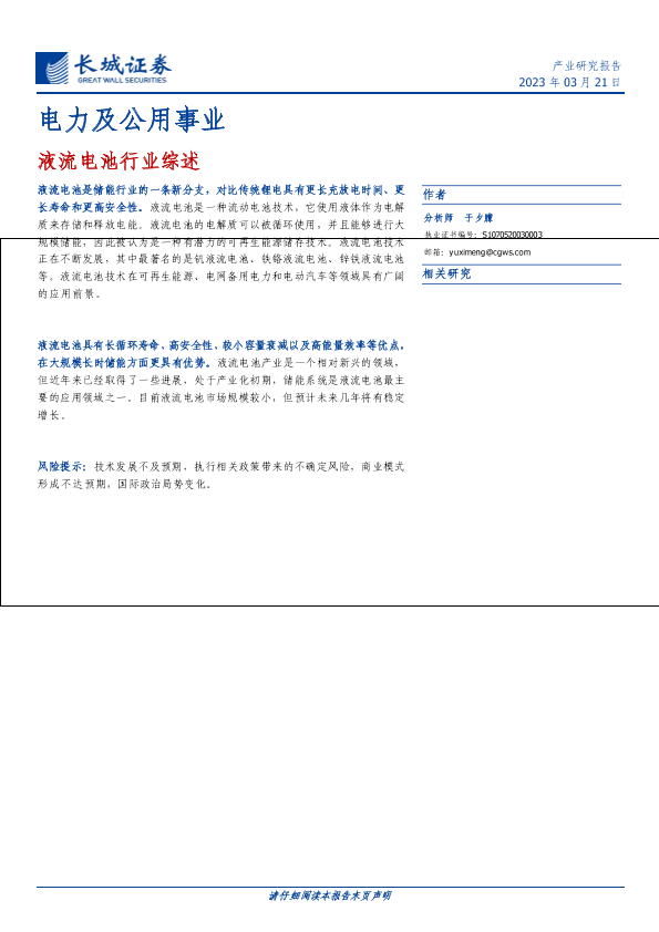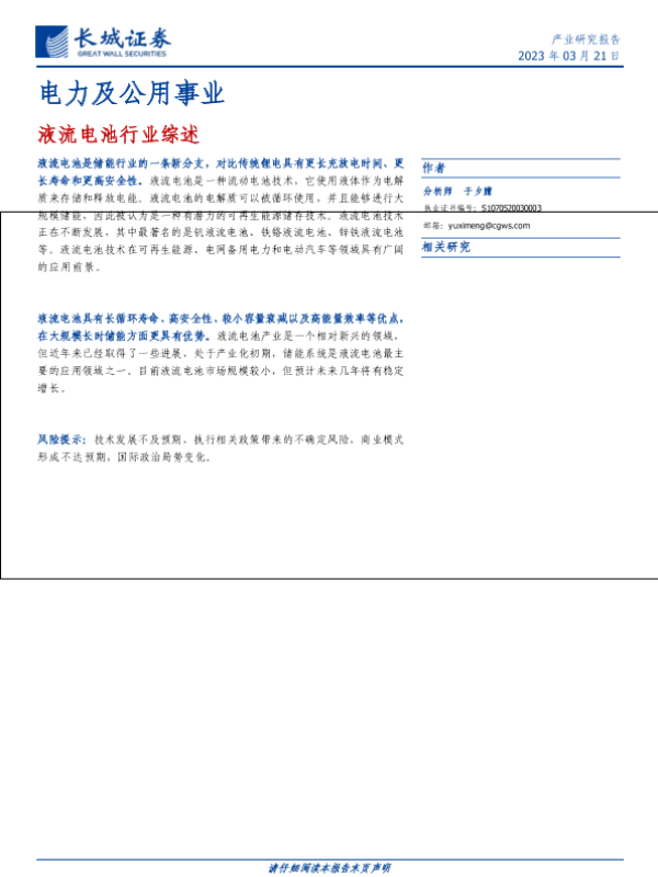【长城证券】【20230321】电力及公用事业行业:液流电池行业综述-16页