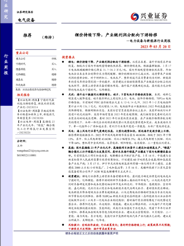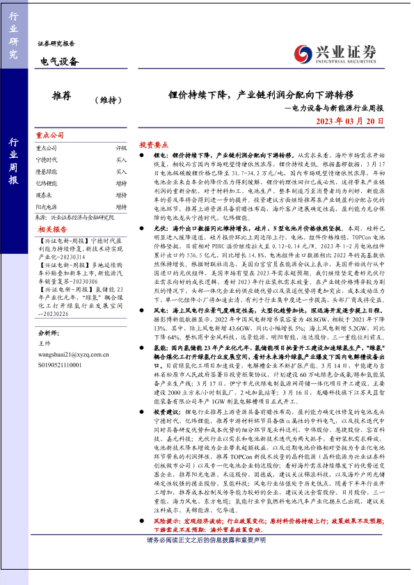 【兴业证券】【20230320】锂价持续下降,产业链利润分配向下游转移—电力设备与新能源行业周报-20页