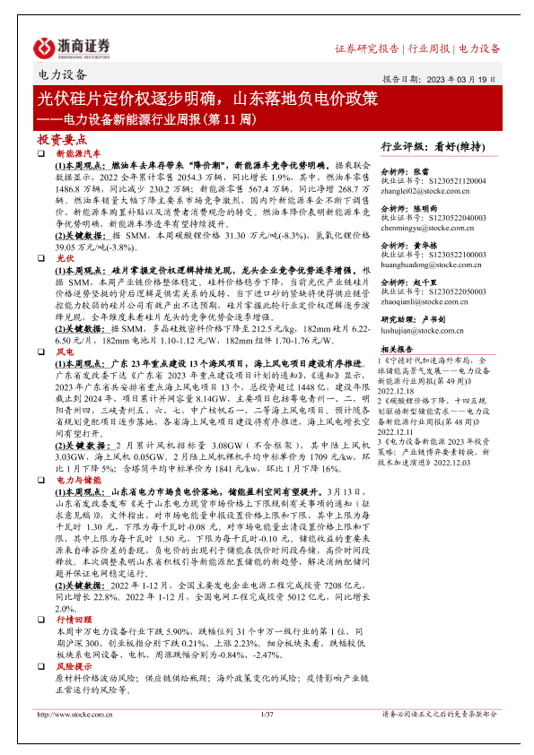 【浙商证券】【20230319】电力设备新能源行业周报(第11周):光伏硅片定价权逐步明确,山东落地负电价政策-37页