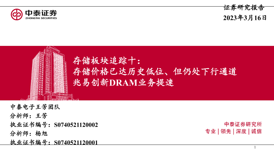 【中泰证券】【20230316】电子行业存储板块追踪十:存储价格已达历史低位、但仍处下行通道兆易创新DRAM业务提速-49页