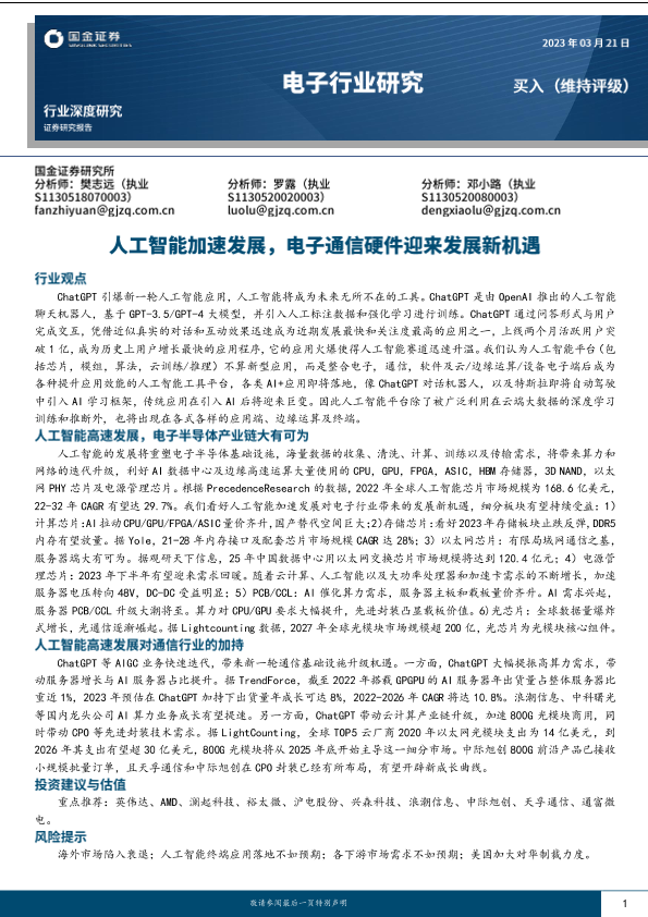 【国金证券】【20230321】电子行业深度研究:人工智能加速发展,电子通信硬件迎来发展新机遇-36页