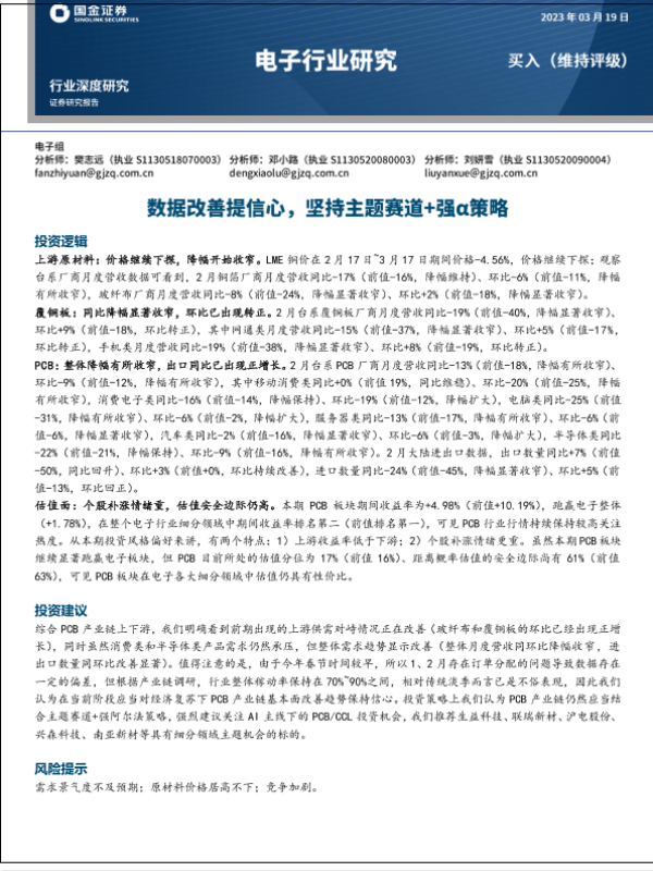 PCB产业链 主题赛道 强阿尔法策略 数据改善 电子行业