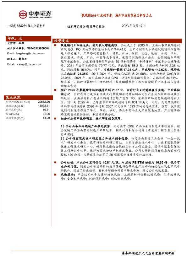 【中泰证券】【20230317】聚氨酯细分行业领军者,海外市场有望成为新发力点-20页