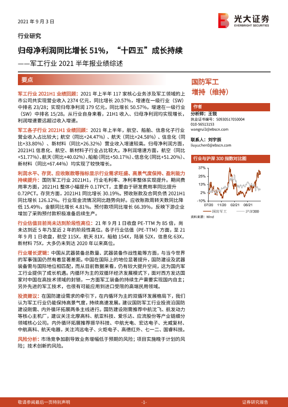 【光大证券】【20210903】军工行业2021半年报业绩综述:归母净利润同比增长51%,“十四五”成长持续-18页