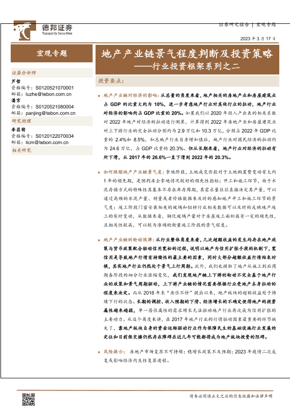 【德邦证券】【20230317】行业投资框架系列之二:地产产业链景气程度判断及投资策略-18页