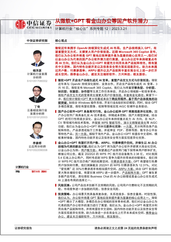 【中信证券】【20230321】计算机行业“核心云”系列专题12:从微软+GPT看金山办公等国产软件潜力-24页