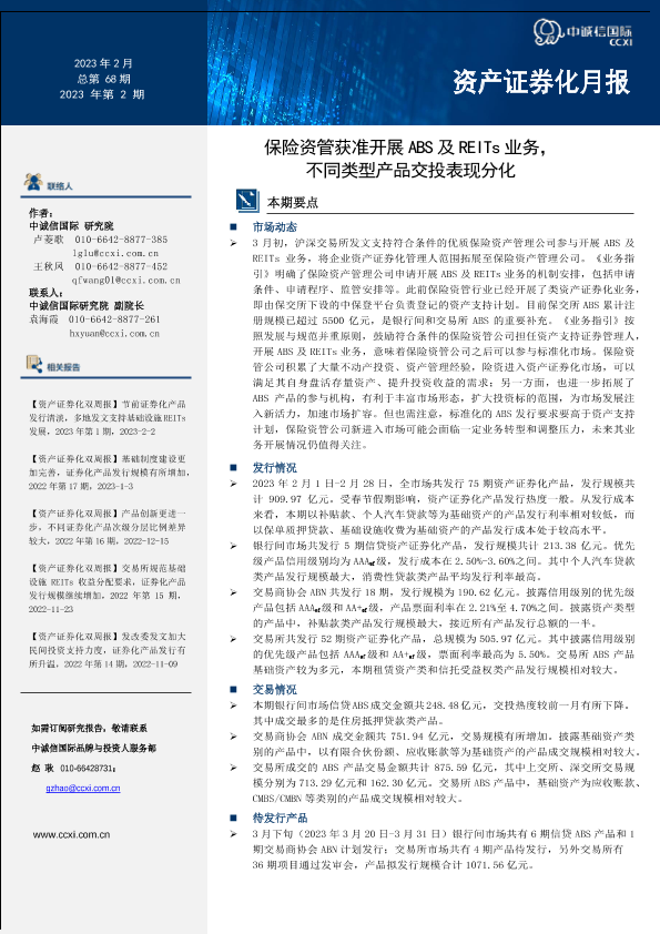 【中诚信国际】【202302】资产证券化月报2023年第2期:保险资管获准开展ABS及REITs业务,不同类型产品交投表现分化-17页