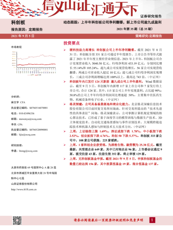 【山西证券】【20210905】动态跟踪2021年第35期(总35期):上半年科创板公司净利翻番,新上市公司逾九成盈利-23页