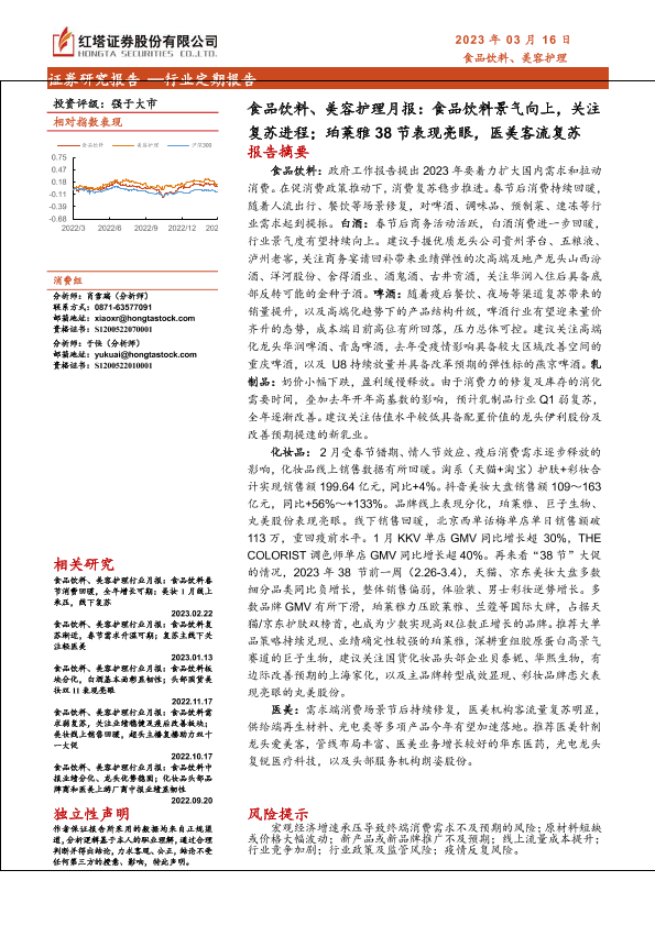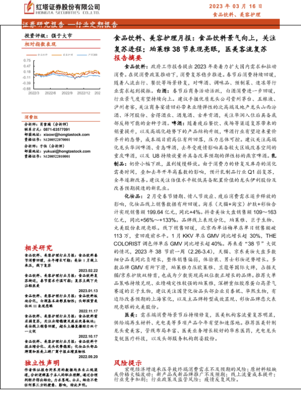【红塔证券】【20230316】食品饮料、美容护理行业月报:食品饮料景气向上,关注复苏进程;珀莱雅38节表现亮眼,医美客流复苏-17页