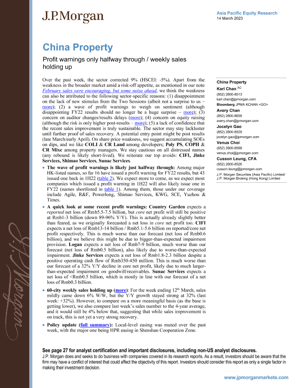 【J.P. Morgan】【20230314】中国房地产:利润预警仅过半周/周度销售保持稳定-31页