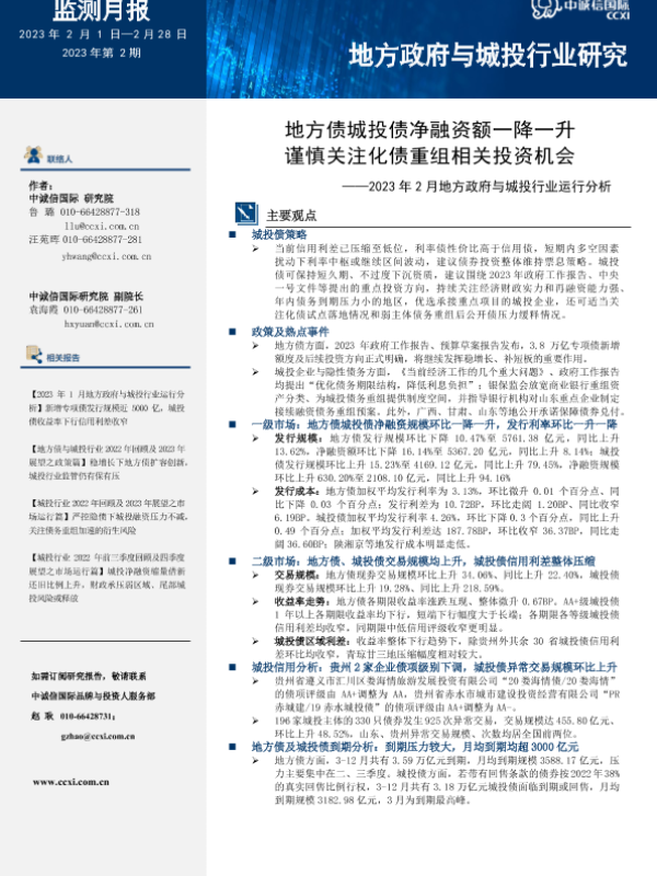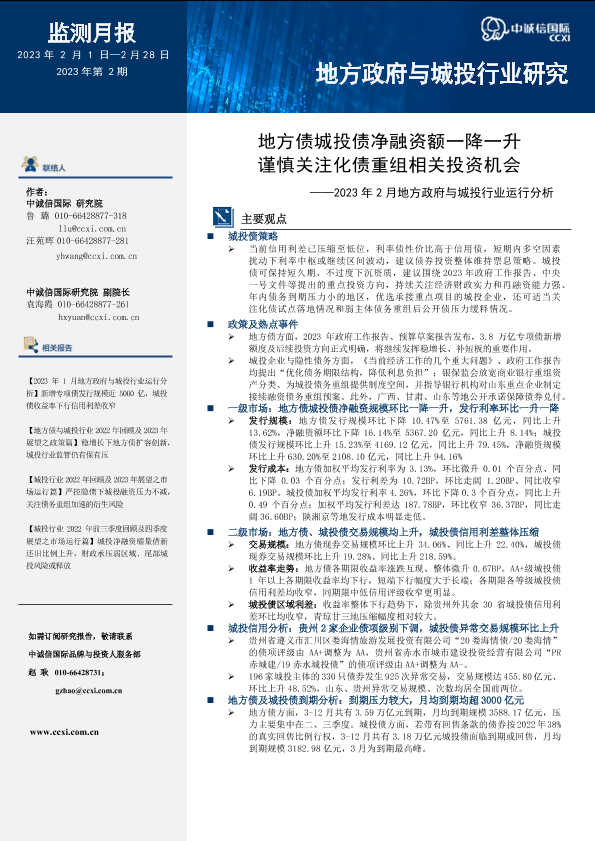 【中诚信国际】【20230228】中诚信-地方债城投债净融资额一降一升,谨慎关注化债重组相关投资机会——2023年2月地方政府与城投行业运行分析-18页