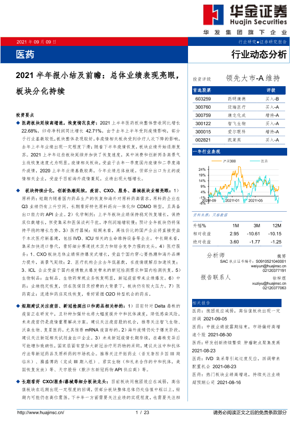 【华金证券】【20210909】医药行业2021半年报小结及前瞻:总体业绩表现亮眼,板块分化持续-23页