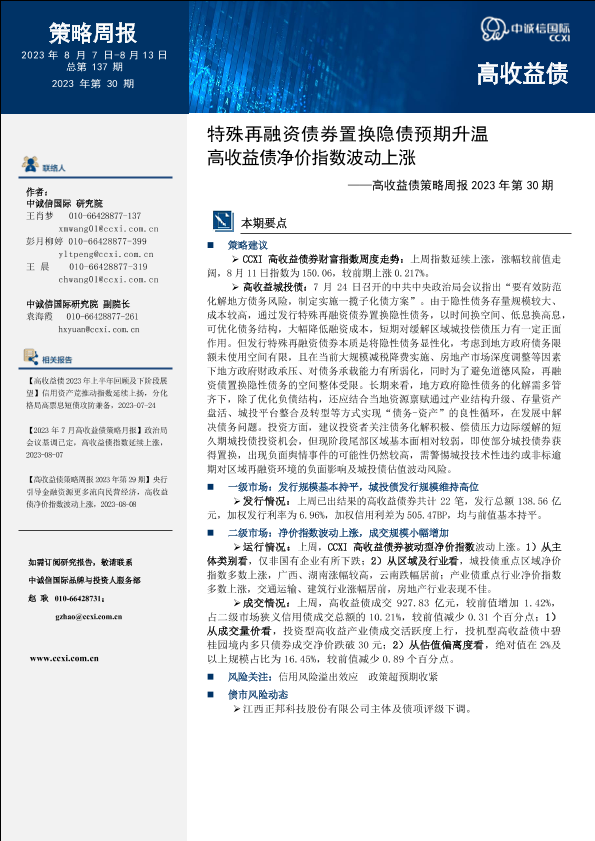【中诚信国际】【20230813】高收益债策略周报2023年第30期:特殊再融资债券置换隐债预期升温高收益债净价指数波动上涨-15页
