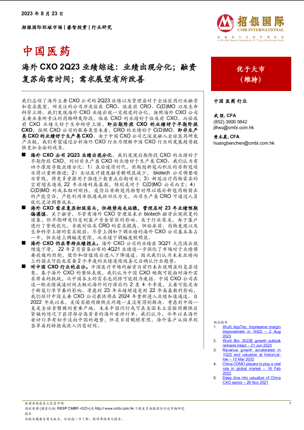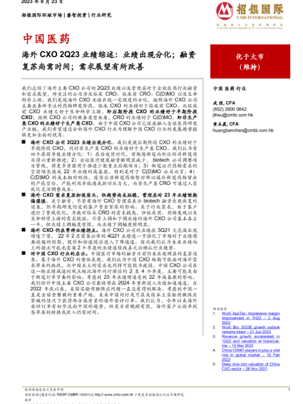 【招银国际】【20230823】中国医药行业研究:海外CXO 2Q23业绩综述:业绩出现分化;融资复苏尚需时间;需求展望有所改善-43页