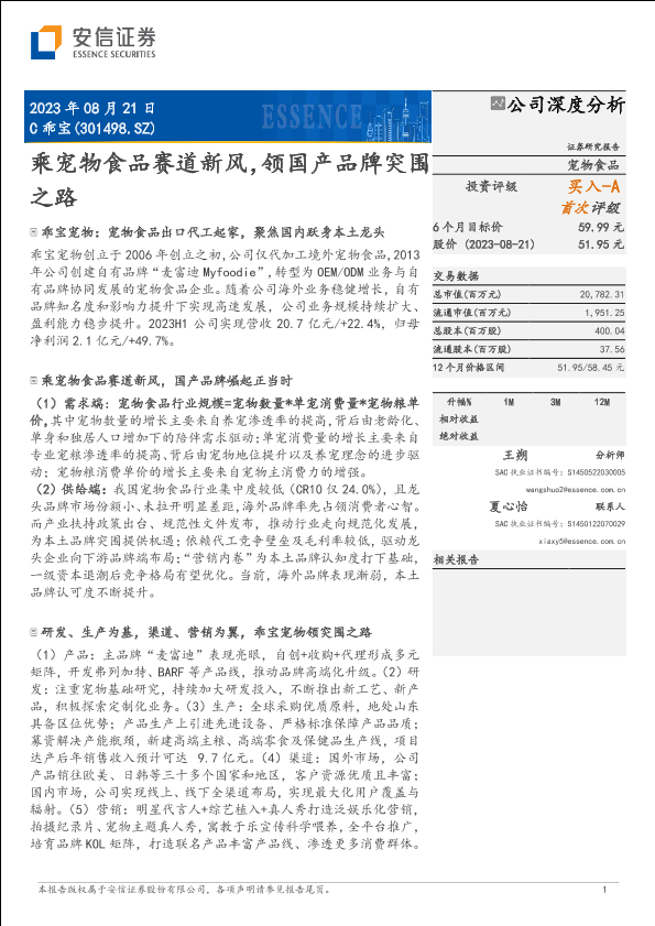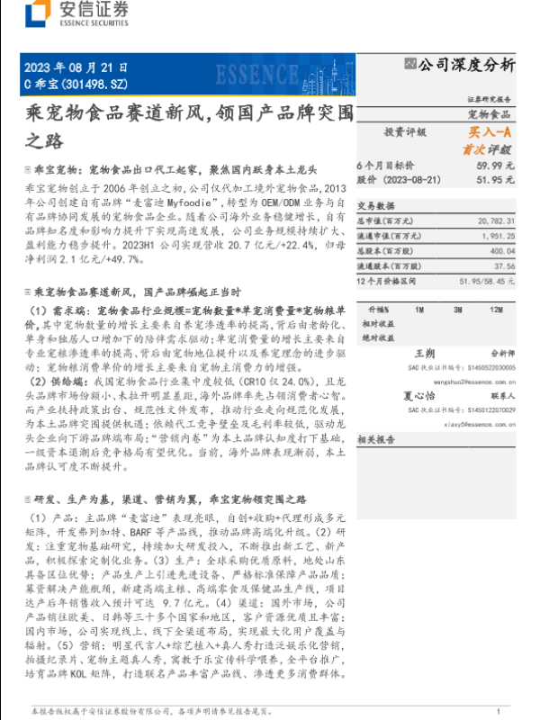 【安信证券】【20230822】乖宝宠物(301498)乘宠物食品赛道新风,领国产品牌突围之路-40页