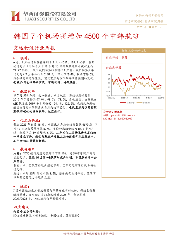 【华西证券】【20230820】交运物流行业周报:韩国7个机场将增加4500个中韩航班-22页