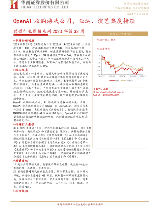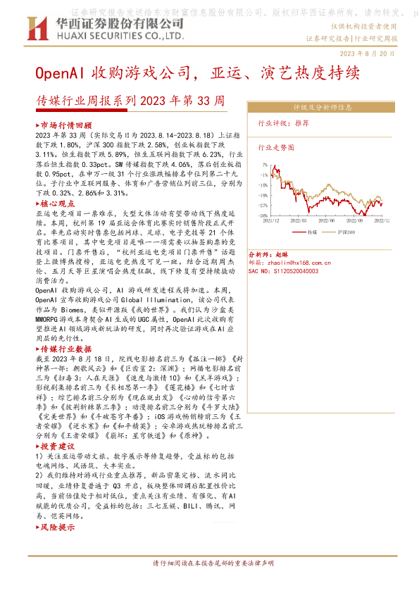 【华西证券】【20230820】传媒行业周报系列2023年第33周:OpenAI收购游戏公司,亚运、演艺热度持续-42页