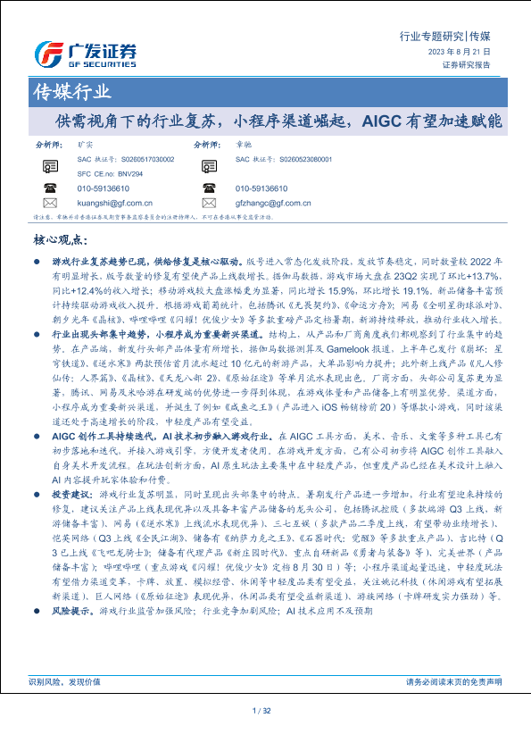 【广发证券】【20230821】传媒行业:供需视角下的行业复苏,小程序渠道崛起,AIGC有望加速赋能-32页