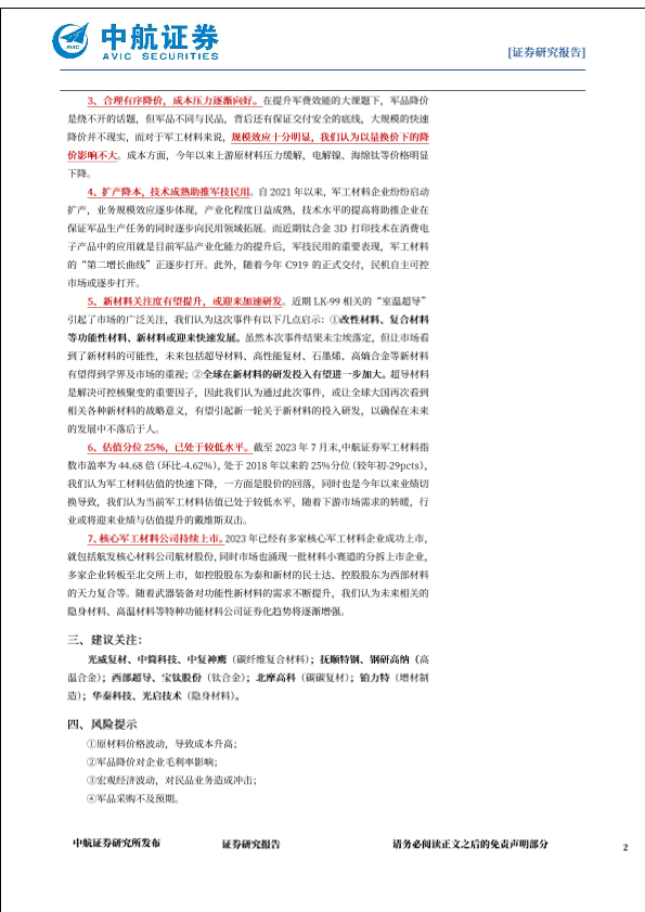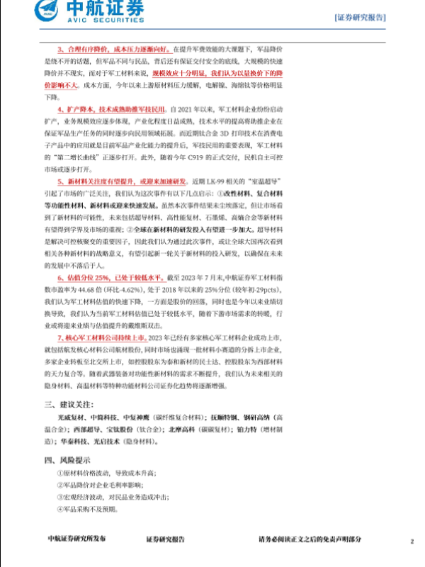 【中航证券】【20230817】军工材料行业月报:关注军技民用趋势,新一轮新材料投入有望来临-15页