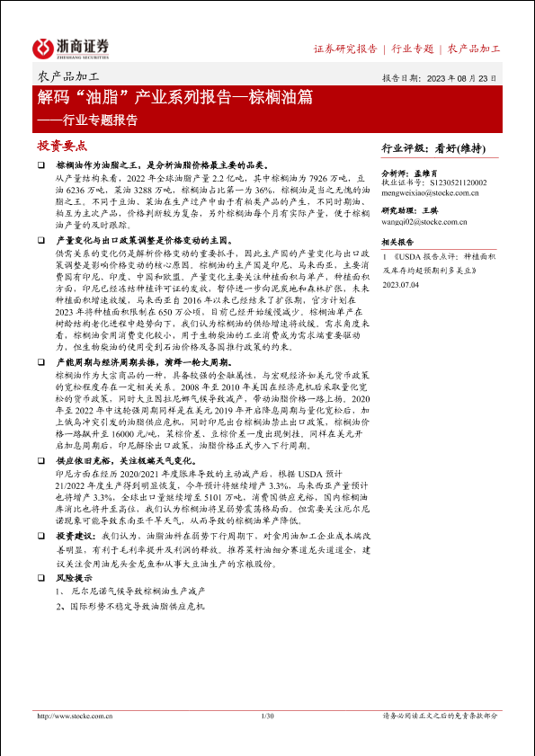 【浙商证券】【20230823】解码“油脂”产业系列报告—棕榈油篇-30页