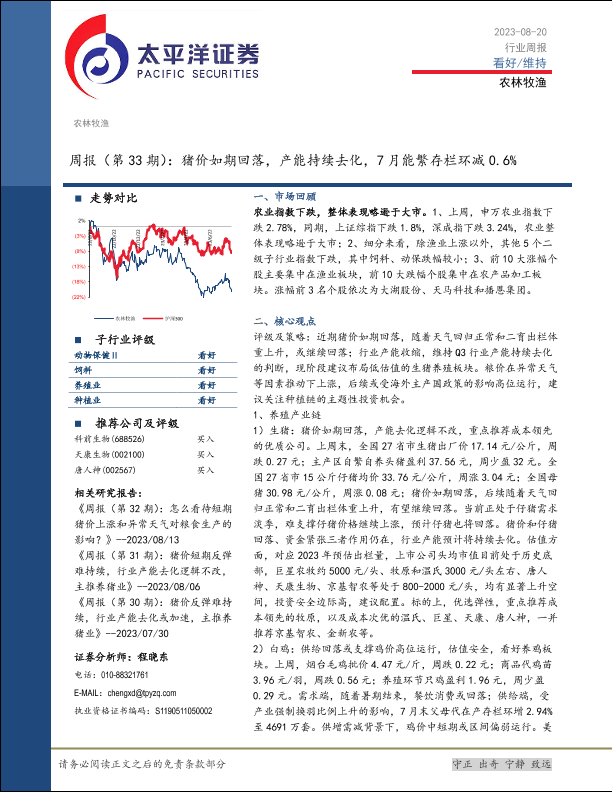 【太平洋证券】【20230820】农林牧渔周报(第33期):猪价如期回落,产能持续去化,7月能繁存栏环减0.6%-17页