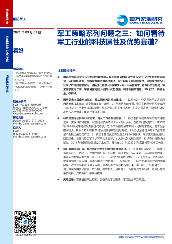 【申万宏源】【20210909】国防军工行业军工策略系列问题之三:如何看待军工行业的科技属性及优势赛道?-42页
