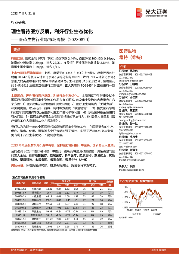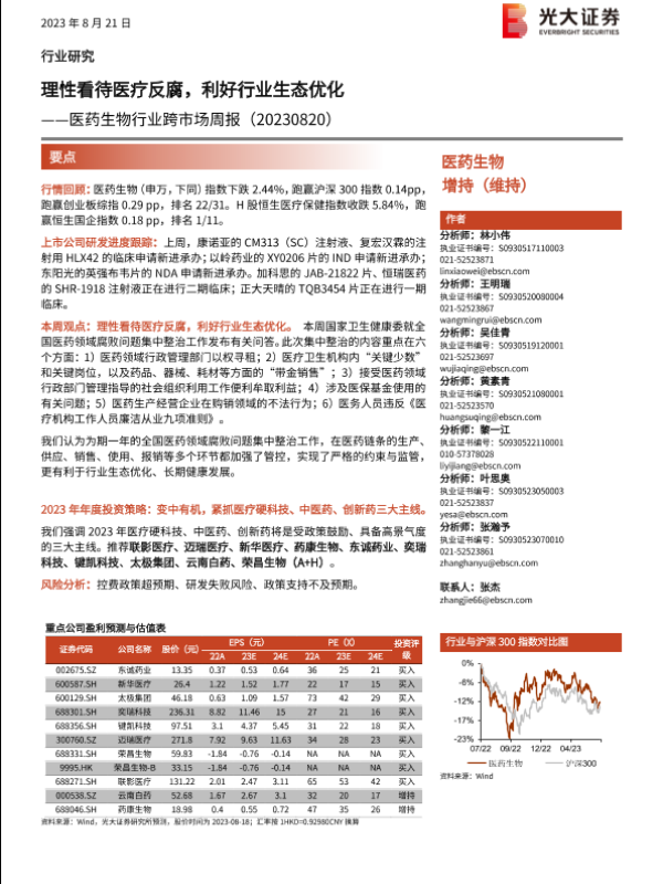 【光大证券】【20230821】医药生物行业跨市场周报:理性看待医疗反腐,利好行业生态优化-22页