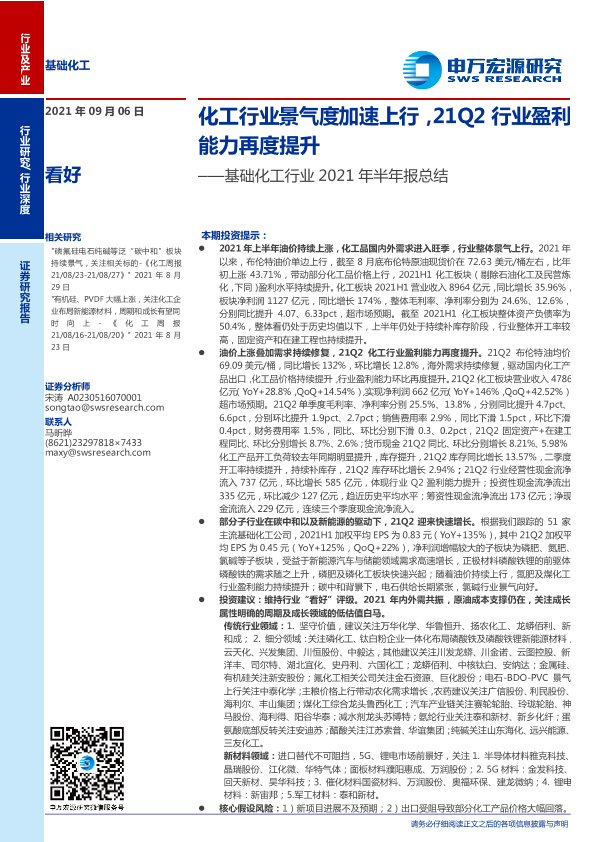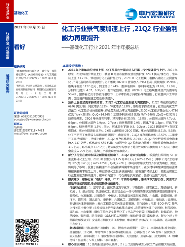 【申万宏源】【20210906】基础化工行业2021年半年报总结:化工行业景气度加速上行,21Q2行业盈利能力再度提升-25页
