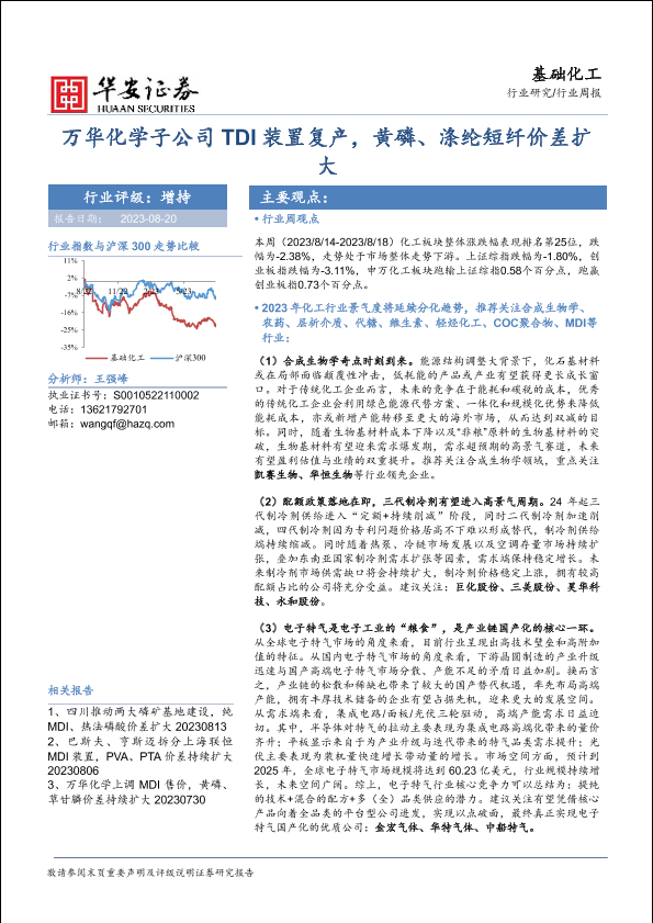 【华安证券】【20230820】基础化工行业周报:万华化学子公司TDI装置复产,黄磷、涤纶短纤价差扩大-43页
