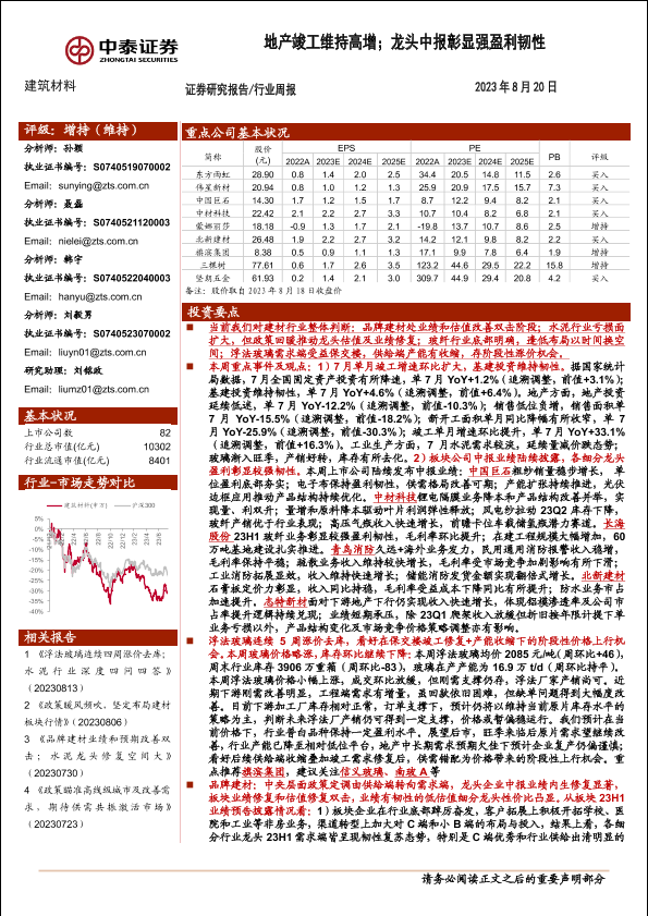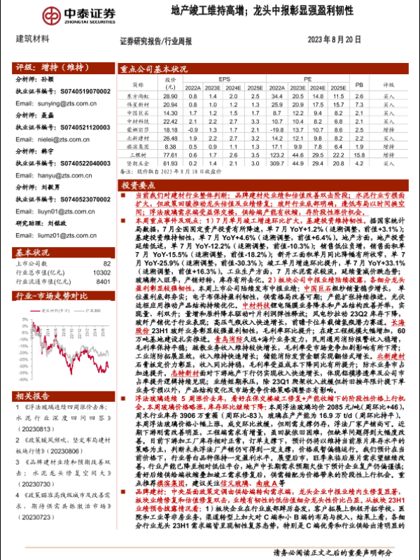 【中泰证券】【20230820】建筑材料行业周报:地产竣工维持高增;龙头中报彰显强盈利韧性-25页