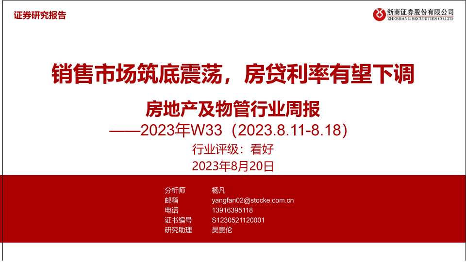 【浙商证券】【20230820】房地产及物管行业周报2023年W33:销售市场筑底震荡,房贷利率有望下调-30页